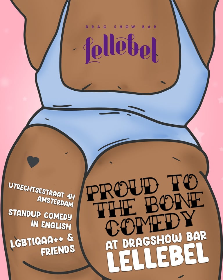 Proud to the Bone Comedy is an inclusive queer comedy night held at Lellebel, one of Amsterdam's oldest drag bars. For this project it was improtant to showcase a bold, body-postive style to caputure the show's spirit of celebration and self-expresion.